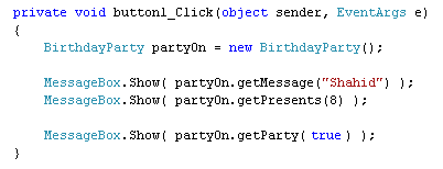 We've created a new BirthdayParty object and called it partyOn. Then comes three message boxes. The first two call the Methods from the HappyBirthday class. The final one calls the Method from the derived class, which is BirthdayParty.